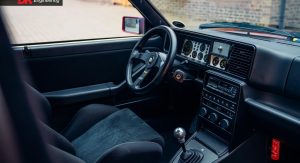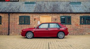 This Delta Integrale Evoluzione II Edizione Finale is being sold by DK Engineering in the UK and is painted in a shade of red dubbed Rosso Amaranto. It also sports a center stripe finished in Turin Yellow and Blu and sits on Anthracite grey 16-inch wheels.