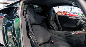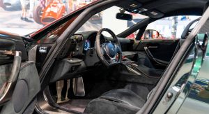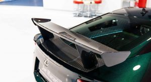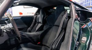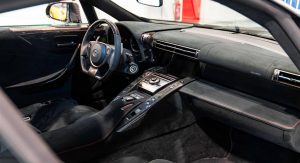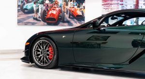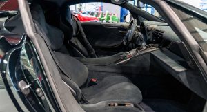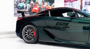 The car kept its original paint color of white until 2019, at which point it was refinished in the deep green hue it currently wears today. “Emerald T”, as the unique color is called, is a deep green with a metallic gold flake, and it was achieved with TopazSkin, a removable hybrid of paint and paint protection film. Complementing it is a set of magnesium BBS wheels, which were standard issue on every LFA with the Nurburgring Package. Unlike the exterior, though, the interior was never changed, retaining the same black Alcantara upholstery and carbon-fiber trim from new.